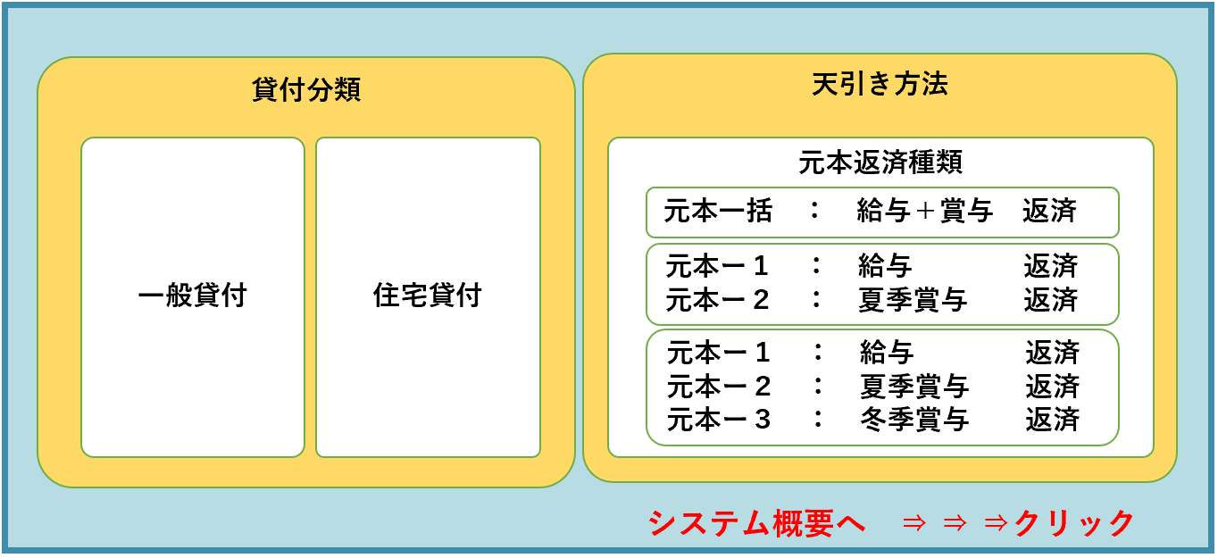 | 天引(給与,賞与)と償還管理 | 臨時償還(繰上)管理 |